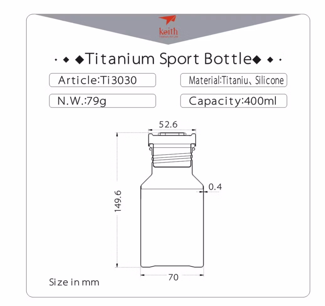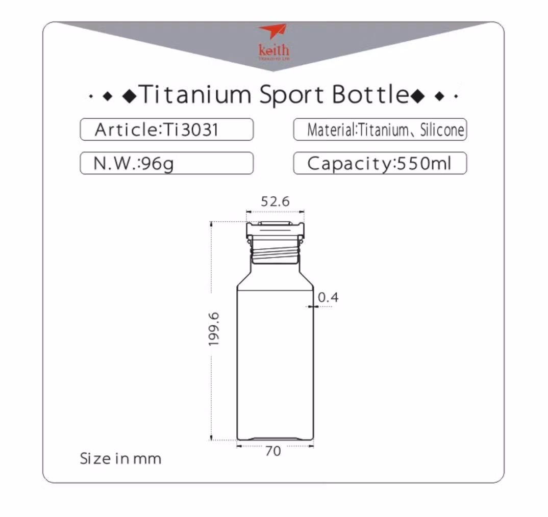 Keith Titanium Ti3031, Ti3030, Ti3032 är en högkvalitativ och ultralätt flaska tillverkad av titan. Den är perfekt för alla som söker en lätt och pålitlig lösning för att ta med sig vatten eller annan dryck under sportaktiviteter eller resor.