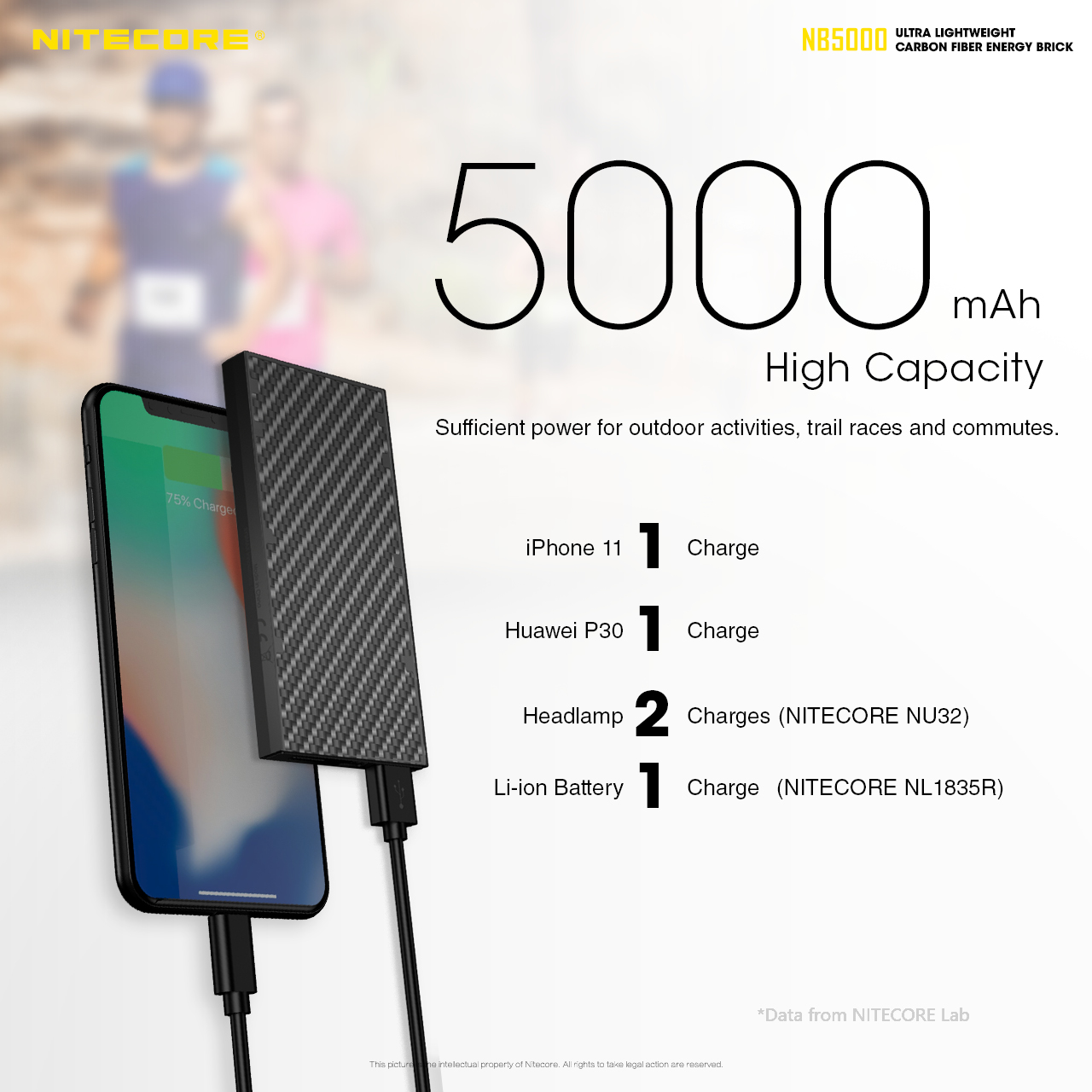 Never let your phone die! The Nitecore NB5000 power bank has a5,000mAh high capacity battery that can quick-charge an iPhone 11 or a Samsung s10. Embodying all these power in a solid carbon fiber body frame, the NB5K is 32% lighter than conventional power banks, while smaller and thinner than a phone, with a sleek modern minimalist design. The NB5000 is the ultimate portable backup battery charger for road warriors, outdoor enthusiasts who enjoy trail running, hiking or camping, or first responders who are on an extended search and rescue mission. It is also a great additional to your emergency prep kit or bug-out-bag.