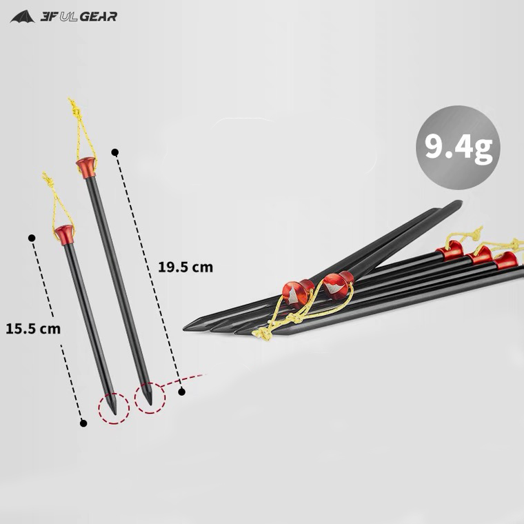 3F UL Gear's tent poles made of light and durable aluminum with yellow drawstring for increased visibility. Works as a complement to your current tent pegs, or to replace your old broken ones. Suitable for all tents and weighs only 9.4 grams per piece and 15.5 cm in length.