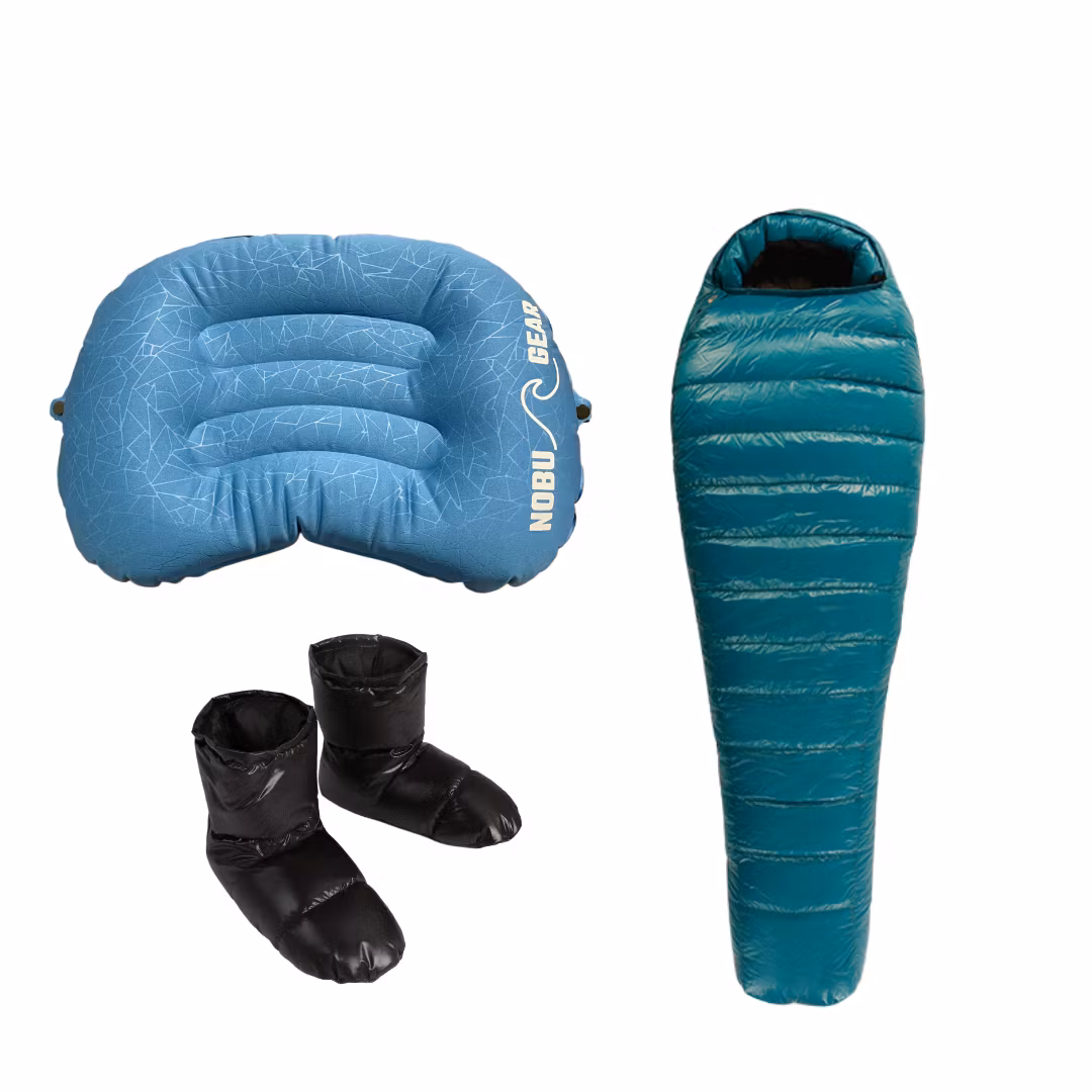 Sovpaket – ett perfekt kit för dig som vill sova bekvämt utan att bära tungt. Paketet kombinerar tre noggrant utvalda produkter som tillsammans ger maximal komfort under dina äventyr: den ultralätta dunsovsäcken Aegismax M3, den uppblåsbara kudden Nobu Gear AirRest Pillow och varma duntofflor fyllda med dun för att hålla fötterna sköna även under kyliga nätter.
