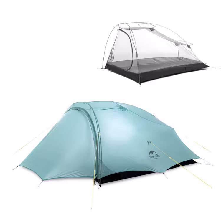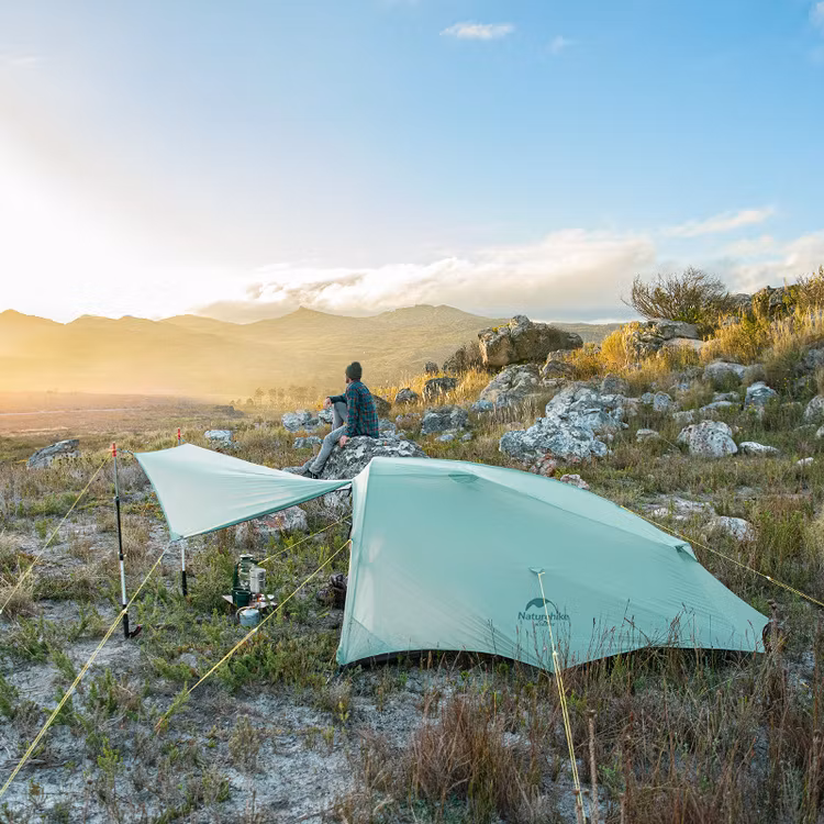 Shared 2 är en tvåmanna kupoltält från Naturehike, tältet har en mycket god ventilationsförmåga och ingången kan även fällas upp och blir ett tak med hjälp av dina stavpinnar. Tältet kan användas från vår till höst och är lätt att sätta upp. Det tåliga yttertältet är gjort av väderskyddat polyestermaterial och står stadigt i ruskväder samtidigt som det låter luften flöda inne i tältet.