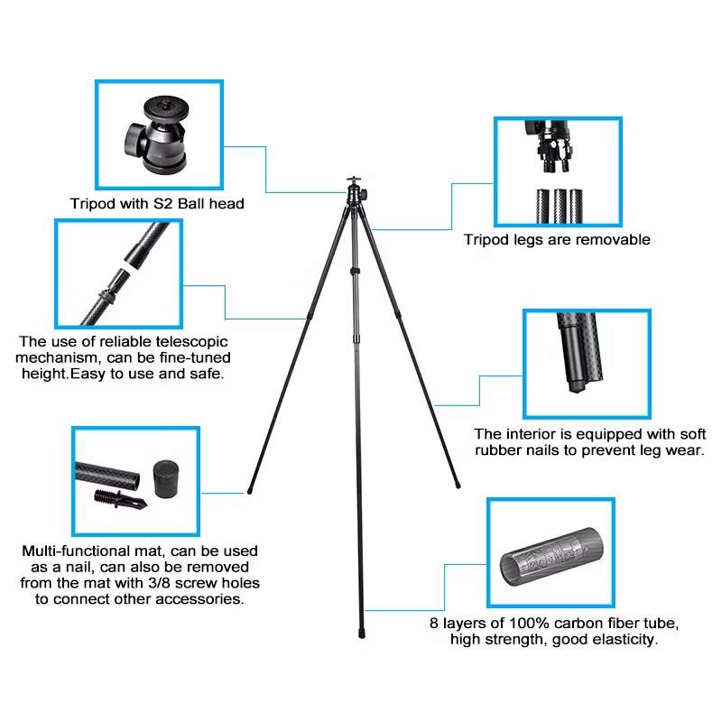 Designad för utomhusäventyr, passar detta ultralätta kamerastativ perfekt för camping, vandringar eller alla resor där varje uns räknas. Dess bärbara natur gör det enkelt att transportera utan att kompromissa med stabilitet och prestanda.